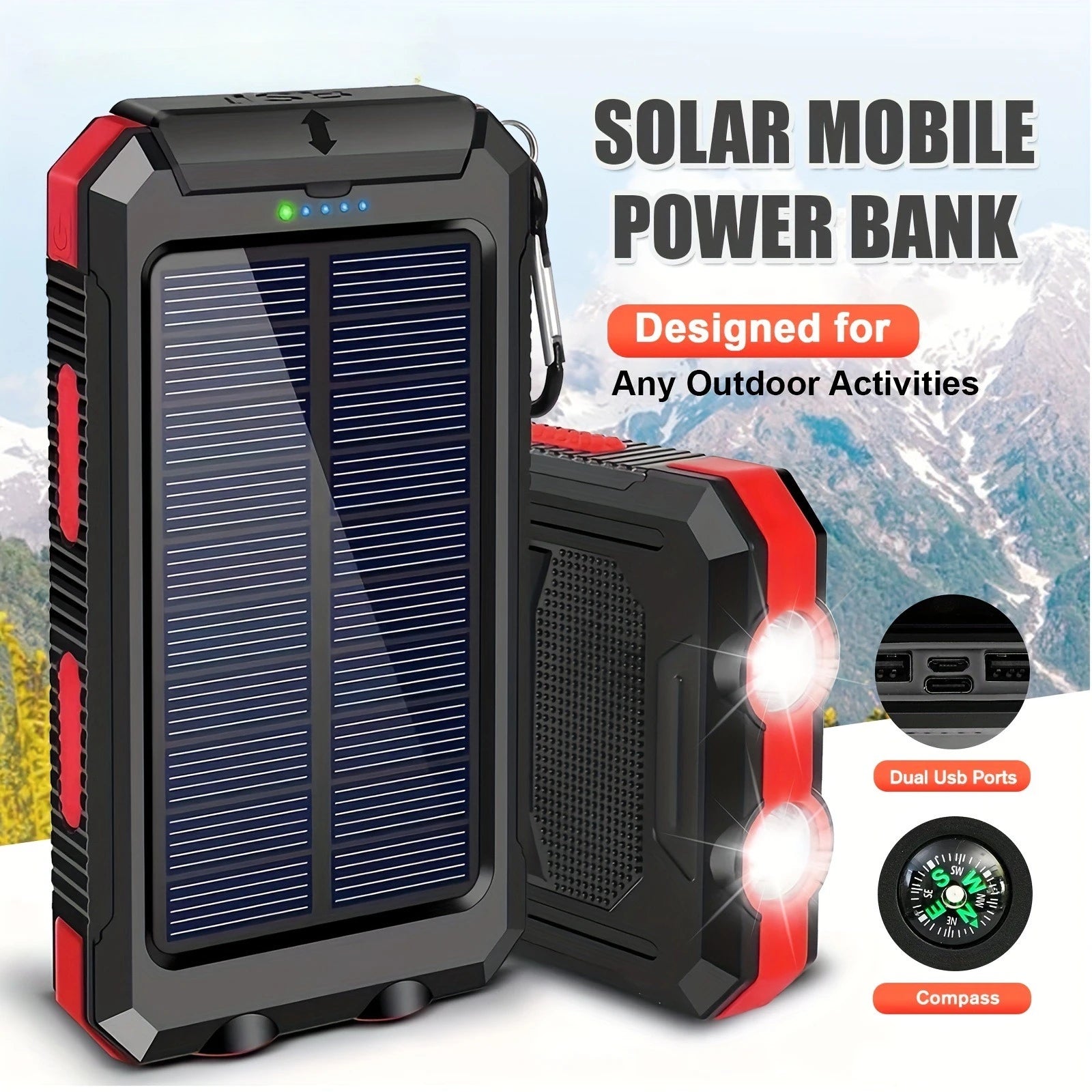 Charge confidently wherever you roam with the Solar Power Bank — a rugged, large-capacity external battery that blends off‑grid solar charging with fast USB output and practical outdoor features. Designed to keep iPhone, Samsung, Xiaomi and most USB-powered devices powered on camping trips, road adventures, and emergency outages, this power bank becomes your dependable companion when outlets are scarce.